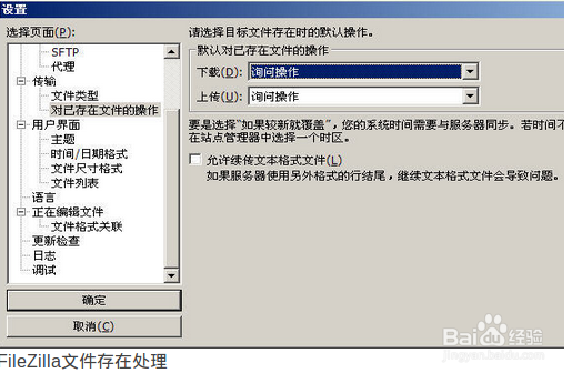 文件存在处理就是当传输文件过程中,如果遇到相同文件名的文件怎么处理?FileZilla共提供了七种方。通过菜单【传输】—>【对已存在文件的默认操作】我们就可以进行相关的设置。