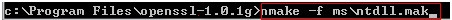 在openssl目录下(C:\Program Files\openssl-1.0.1g)执行“nmake -f ms\ntdll.mak”,如下图所示: