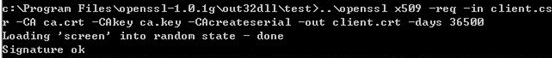 4) 生成证书文件:..\ openssl x509 -req -in client.csr -CA ca.crt -CAkey ca.key -CAcreateserial -out client.crt -days 36500