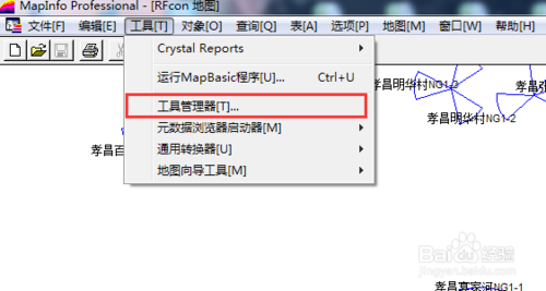 接下来我们打开MapInfo软件,寻找文件栏里的工具,工具中下拉我们会看到工具管理器,只有在管理器才能添加各类工具。