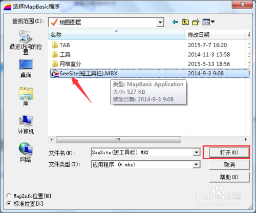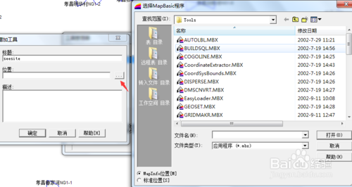 增加工具的浮框有3栏,我们在标题上填写seesite以便日后查找和使用,接着点击位置栏的(...),从弹出的查找程序中我们选择事先放入图层文件夹的seesite.MBX短工具,选择。