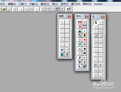 这里给大家看看安装完毕后的效果,seesite功能强大,分为3个系列,最左边的绘图可以方便修改MapInfo里图层的细节,优化栏可以对数据进行各种分析统计,最右边的一栏是负责操作(地图缩小放大等)的操作栏。