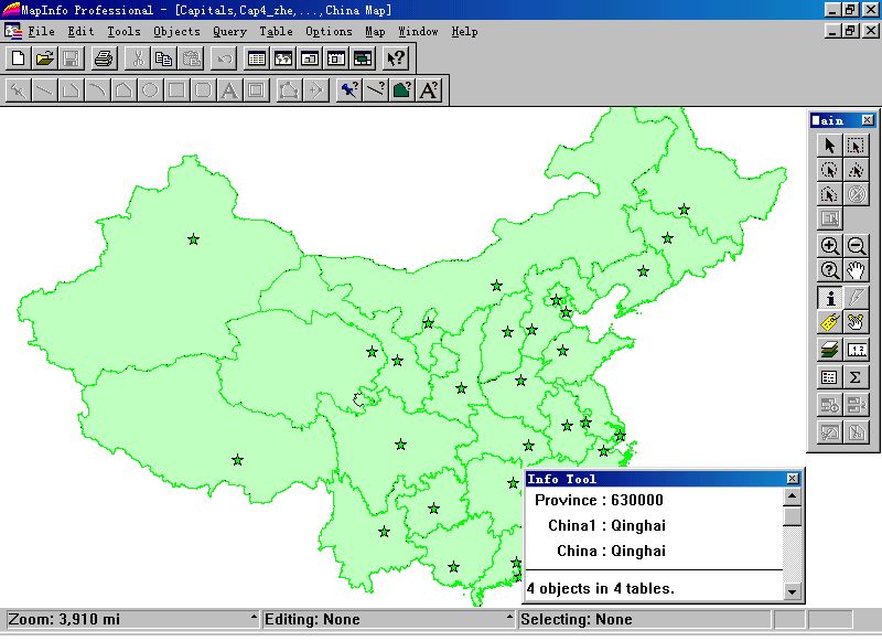MapInfo系统为用户提供了强大而灵活的查询功能,在系统中称为选择(Selection)功能。通过选择既可以直接从地图上查询到相应数据表的信息,也可以利用系统提供的SQL Selection从数据表查到相应的数据和地图信息。系统用一个临时表(Selection表)存放选择的结果,对于临时表也可执行很多用于基础表的操作,如浏览、统计、复制或编辑表,还可进一步生成新的Selection。