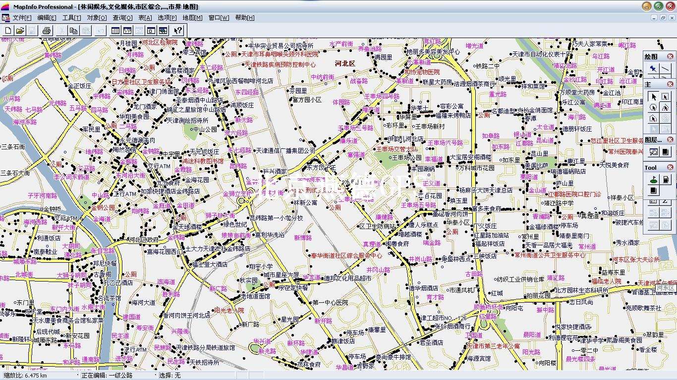 一、图形的输入与编辑图形的输入是将各种地图信息数据进行数字化或转换,以获得MapInfo的基本图形数据组织——表。随数据源的不同可用手扶数字化仪、扫描仪输入或其它标准数据格式转入。如AutoCAD的(.DXF和.DWG)、Intergraph的(.DGN)、ESRI的ArcView Shape数据等。