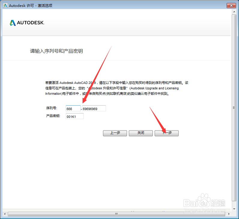 输入产品序列号666-69696969,产品密钥为001K1,并点击下一步,如图所示。