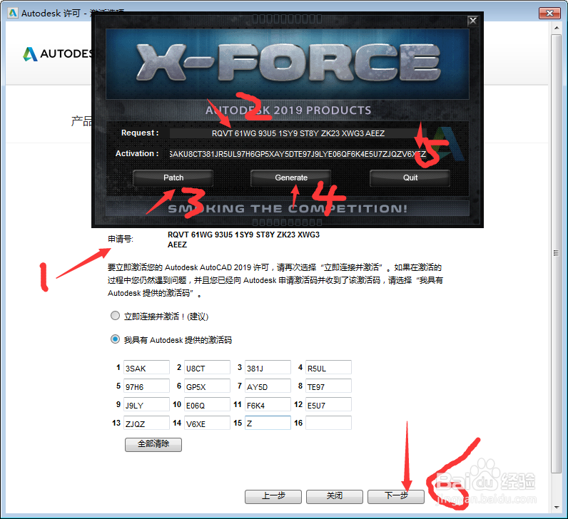 复制申请码到注册机中的request内粘贴,点击patch打补丁,generate生成激活码,复制激活码到激活页面粘贴并点击下一步,如图所示。