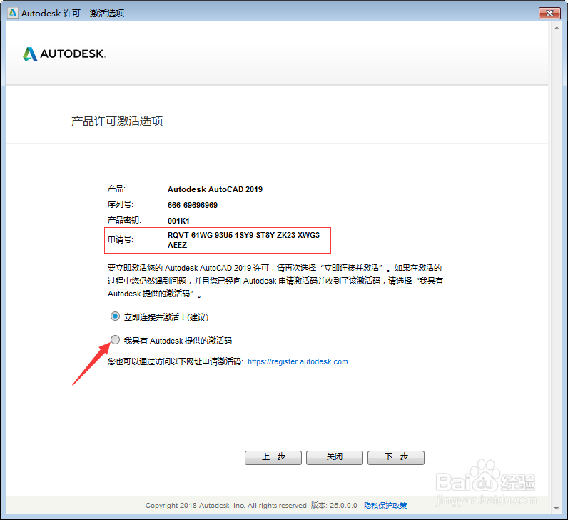 下图中选择我具有激活码并复制申请号,如图所示。
