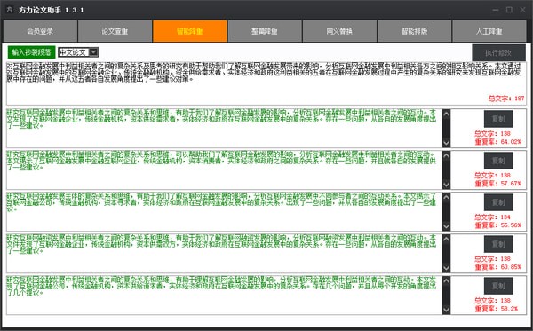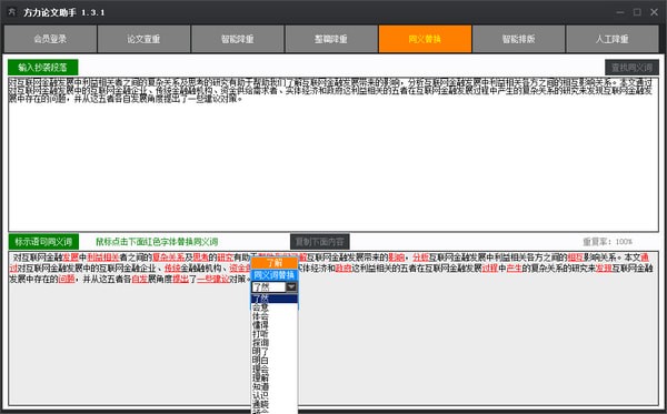 方力论文助手破解版软件可以自动把重复句子修改成五个句子,供你选择,达到降重目的。拓展思路 提高效率 使用方便。