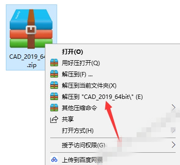 1.鼠标右击cad2019精简版软件安装包,选择解压到CAD2019。