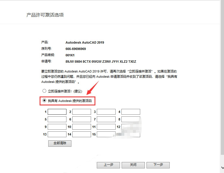 16.把申请号复制到注册机里面的Request中(记得删除原Request中的内容),先点击Patch,再点击Generate后复制Activeation中生成的激活码,然后粘贴激活码至我具有Autodesk提供的激活码方框中。最后点击下一步即可。