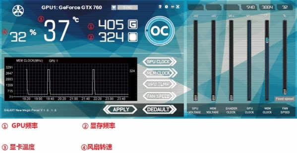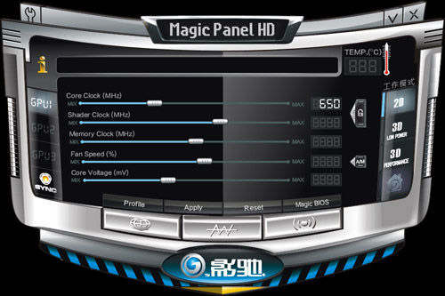 影驰魔盘(Magic Panel HD)新一代的显卡超频软件,是一款为DIY发烧友打造的具有创新意义的软件,这是一个由影驰多年研发经验沉淀而成的智能软件。玩家可以通过魔盘HD友好而简单的界面恢复BIOS、调控风扇转速、对显卡进行超频同时还可以根据用户显卡型号自动检测最新的BIOS和驱动,让玩家有全新的使用体验。