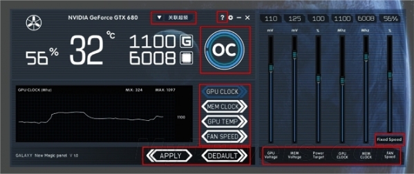 关联超频、求助、超频按钮、各参数窗口显示切换按钮、应用按钮、默认设置按钮