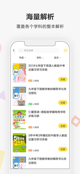 1.解析全:语数英政史地理化生,覆盖全部学科90%以上的课本练习册解析2.查找快:扫描条形码,按书名搜,按年级搜,按学科搜,按版本搜,怎么搜都行