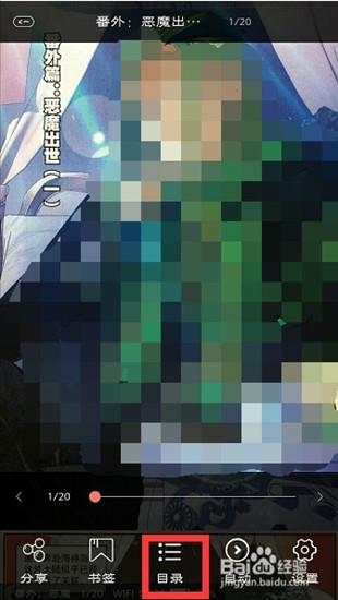 4、点击屏幕中间,可以调出菜单。点击“目录”可以选择想要阅读的章节。其他菜单如“分享”、“书签”、“自动”、“设置”等,小伙伴们可以自己回去慢慢体验。