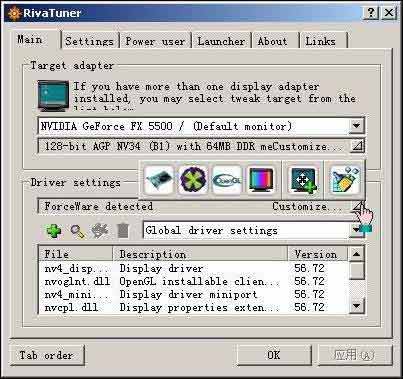 下载安装好RivaTuner,第一次运行时,它会对硬件和驱动信息进行检测,等检测完后,我们可看到它的RivaTuner面板。从上面我们可以看到一些基本信息,如计算机正使用的是NVIDIA GeForce FX 5500显卡,并装上了Forceware 56.72驱动程序。一、RivaTuner全局