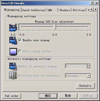 我们先来看看D3D的第一个子面版:Mipmapping。移动MipMapping Setting的滑动杆,如果设定小于0的话,就可以能够让你在不损失性能的前提下获得更加锐利的画面,不过不要太小了,否则容易产生纹理闪烁现象,建议选择-1即可。其实调低Mipmapping LOD只是直接应用更高分辨率的纹理而已,并不会增加像图形芯片进行过滤时所需的数倍运算量和带宽,当然更大的纹理还是会增加一点纹理读取带宽的,但是这和各向异性纹理过滤的带宽需求量相比无疑要低的多。