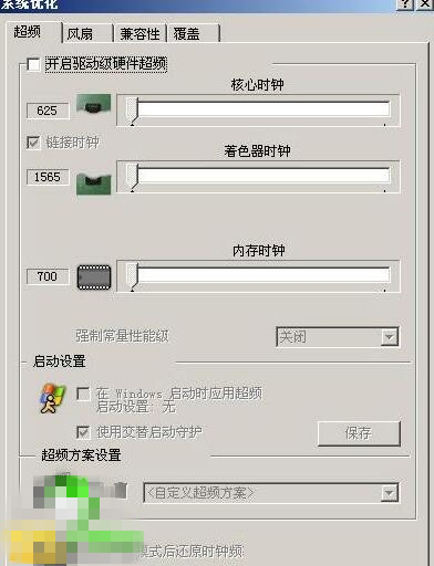 这个面板拥有一个很常用的性能提供面板——Overclocking(超频),大家只要选上Enable driver-level hardware overc,就可打开超频设置,移动滑杆选定核芯和显存频率后,按“Test”对设置进行简单的内部测试,看看硬件能否承受高频压力,通过测试后我们可再选上Apply overclocking at windows startup,哪么当系统启动后就会自动进行超频设置,我们日后都无需再对行进行修改了。而为了考察超频的稳定性,还是建议大家每次调整频率之后运行一下3Dmark03或FarCry等游戏来考察显卡能否稳定工作,看看是否会死机、画面破碎等,如没有的可以继续提升工作频率,当找到合理的超频点后便不需要再改变了。