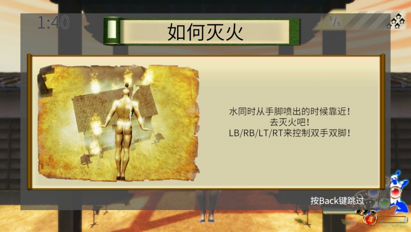 游戏故事设定在日本的江户时代,玩家操作的角色可以从四肢喷出水流。如果使用手柄操作的话,分别有四个按键对应身体四肢的水流。操作得当,可以像是钢铁侠或者喷气式飞机一样漂浮在空中!