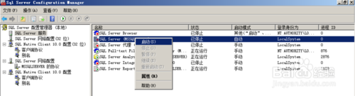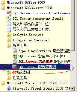 1.点击“开始”—>“所有程序”—>“Microsoft SQL Server 2008”—>“配置工具”—>“SQL Server配置管理器”,进入配置界面,如下图所示: