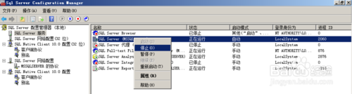 2.选择“SQL Server服务”,在右边的“SQL Server (MSSQLSERVER)”服务上选中,并点击右键,选择“停止”菜单项,终止当前的SQL Server服务,如下图所示:
