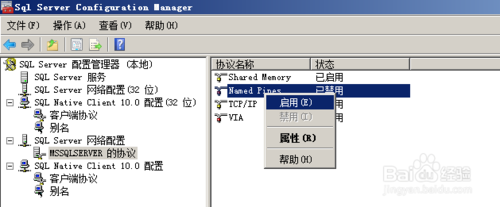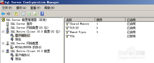 4.选择“SQL Native client 10.0配置(32位)”—“客户端协议”,用和上面同样的方法启用named pipe 和 TCP/IP,如下图所示: