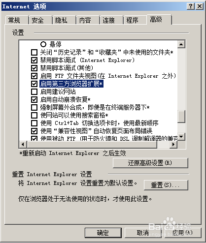 1.打开IE,选择“工具”—“选项”—“高级”—“浏览”。