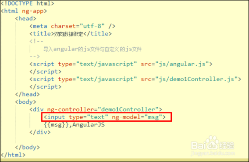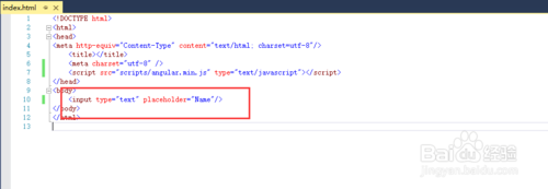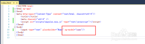 5.然后我们给上面添加的input输入框添加一个ng-model属性,如下所示,ng-model在angularjs中起到了数据双向绑定的关键性作用