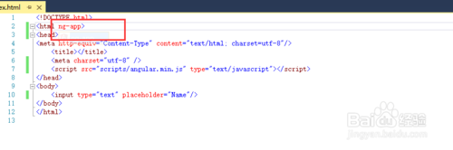 4.下面我们就要添加angularjs的内容了,首先给页面添加一个ng-app标记,这个标记标识了从此标记往下都是angularjs的领域了