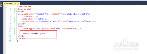 6.下面我们就是要输出input里的内容了,在Jquery中我们一般是先获得input元素,然后获取里面的值赋值给span,而在angularjs中都省略了,直接通过表达式语句{{}}输出内容即可