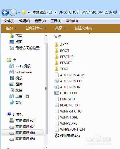 把“WIN7-64.GHO”和“硬盘安装.EXE”两个文件剪切到磁盘根目录下,这里选择放在E盘里
