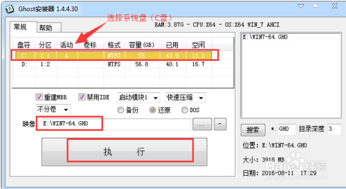 双击“硬盘安装.EXE”,选择“C盘”(C盘为系统磁盘),插入映像文件WIN7-64.GHO,接着点击执行