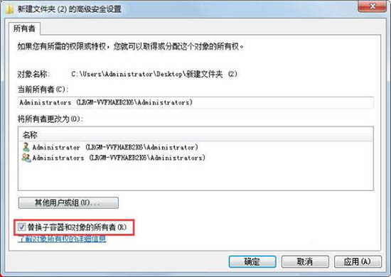 7、勾选“替换子容器和对象的所有者”选项并单击“确定”按钮;如图所示: