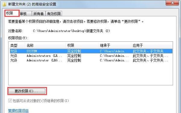 8、在“高级安全设置”窗口中单击“权限”选项卡并点击“更改权限”按钮;如图所示: