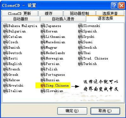 1、首先在“这里(下面附下载网址)”将CloneCD下载到硬盘当中,大小为3252 K。一路next下去就可以安装上,但是发现CloneCD是英文操作界面,对那些E文不是很好的朋友在操作上有些困难。不过你可以在语言设置中选择“Simp.Chinese”,这样一来CloneCD就变成中文界面。
