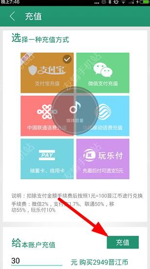 扣除手续费金额手续费按照1元=100晋江币进行兑换;手续费:微信2%,支付宝1.7%,联通50%,移动55%,玩乐付10%