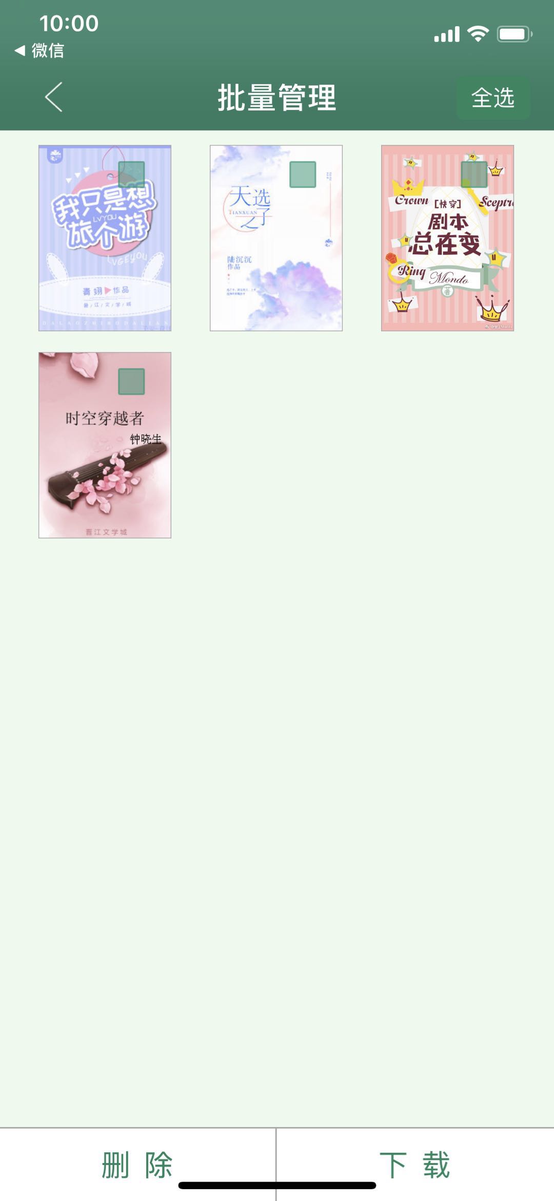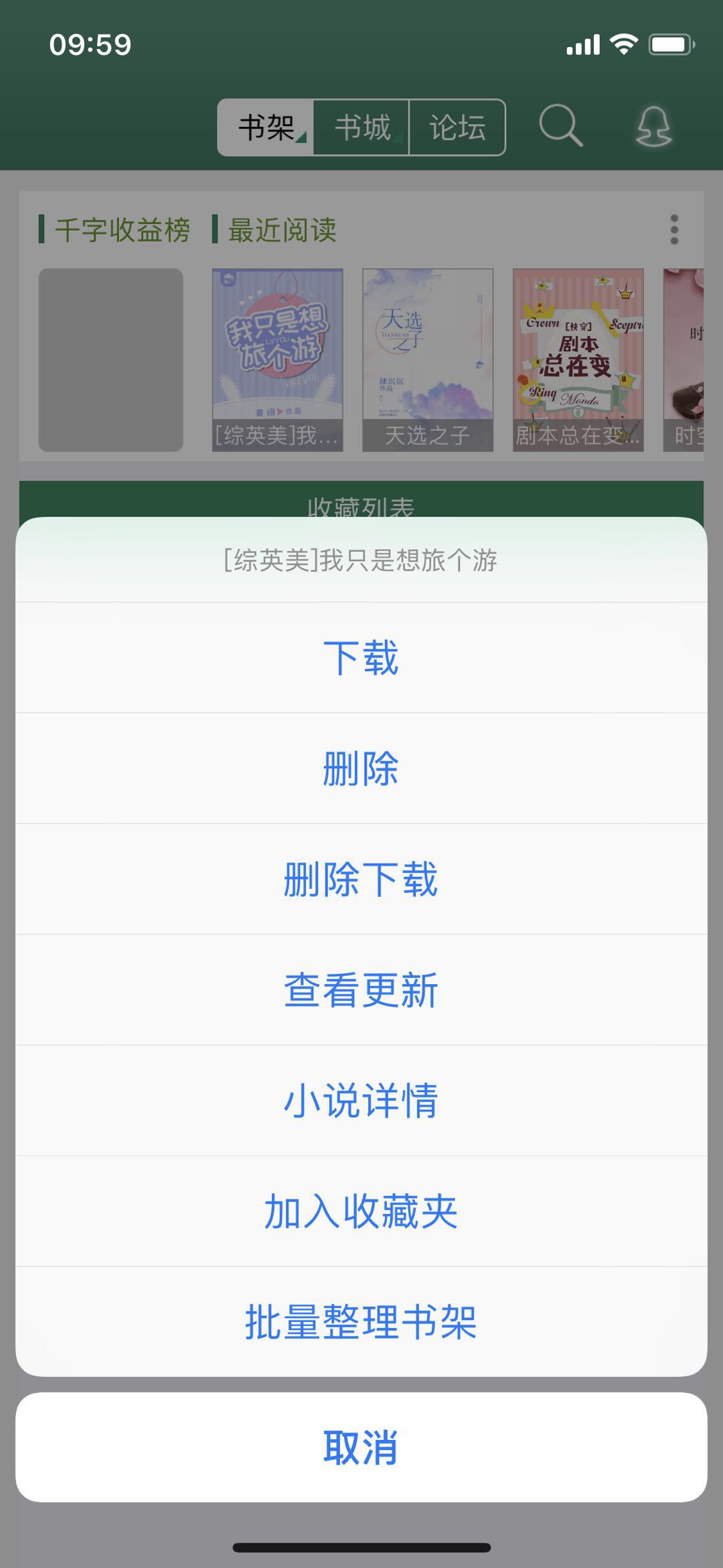 2、长按小说即会跳出下面的选择框,点击批量管理书架。ps:删除以及删除下载只针对单本小说。