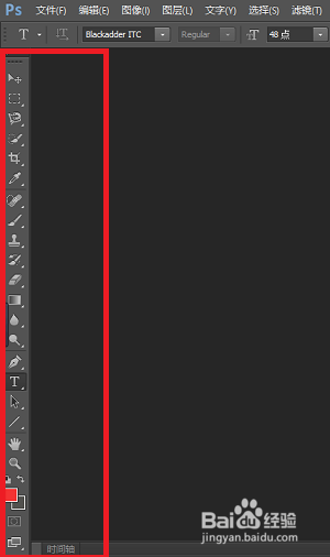 如下图,左侧的是工具栏,有移动工具、选框、裁剪工具、橡皮擦、画笔、仿制印章、渐变工具、放大镜、钢笔工具、文字工具等等