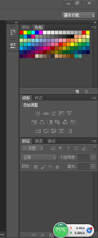 如下图,右侧是窗口调板,在菜单中的窗口菜单,在下拉列表中选择需要的窗口调板,上面一排是功能选择选择项
