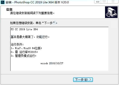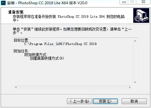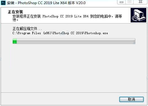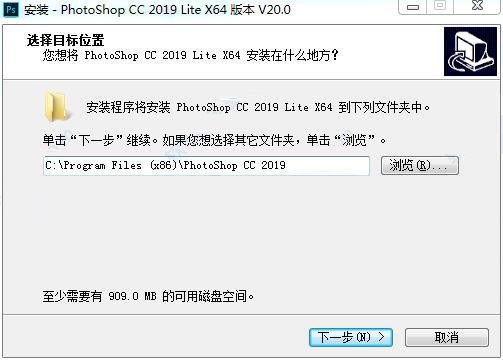 1、在本站下载并解压好文件包,双击“PS_2019_Lite_X64 终极精简版.exe”运行,选择你想要的安装路径,点击“下一步”。