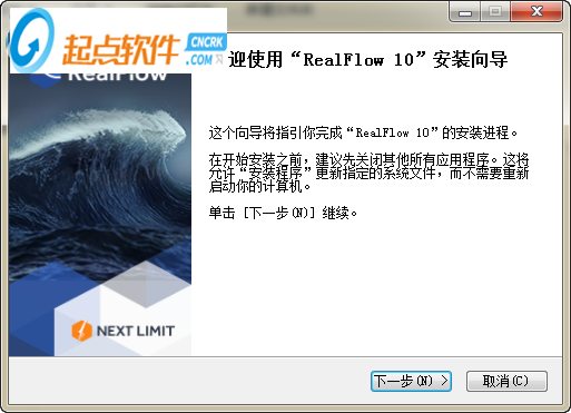 1、下载文件找到"realflow10.exe"双击运行,进入软件安装向导界面;2、进入realflow10 破解版软件的安装向导界面,点击下一步;