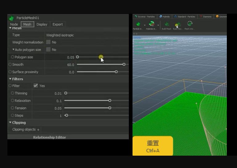 10.粒子测试完成后,接下来为粒子创建网格外形(简单说就是给粒子蒙上皮),打开realflow流体插件,找到网格,单击添加到场景中,这样再播放就可以看到流出来的是被包裹住的粒子了。