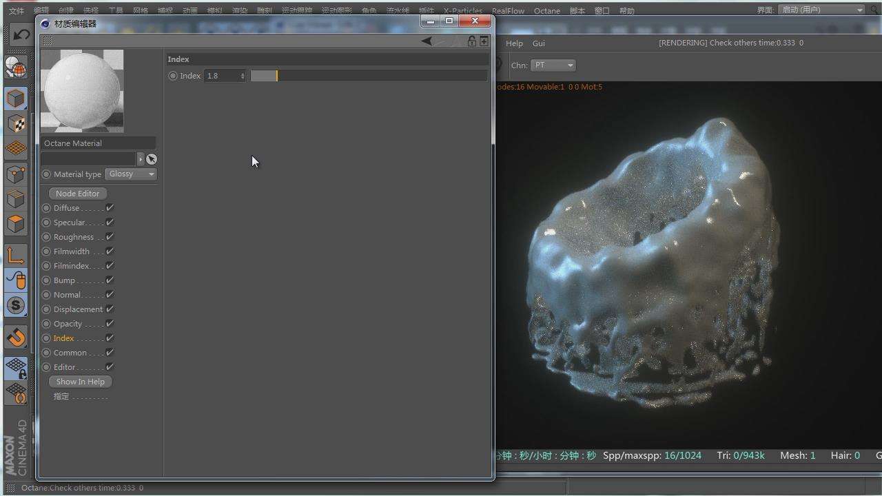 11.然后,给被蒙皮的网格粒子添加材质,水以及饮料的材质可以参考C4D里面的预制文件,那里调整的效果很棒。