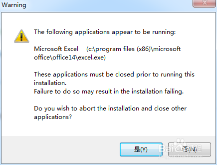 如果你的Excel打开了,你还会看到以下图1警告提示,英文看不懂没关系,大概意思是让你关闭Excel,此时如果你的Excel需要存档请存档后关闭,点击【是】,点击【Finish】,重新安装。