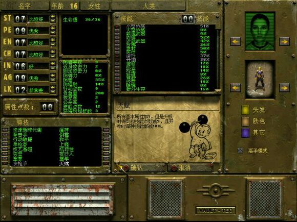普通难度而且非硬汉模式(硬汉模式游戏途中不可存档,还是免了,不找那个虐)。创建个二八俏佳人吧,虽然这不是辐射1,2那种情节模式的,男女其实无所谓。但是本作女性人物还是能占尽不少便宜的。以后会详解。