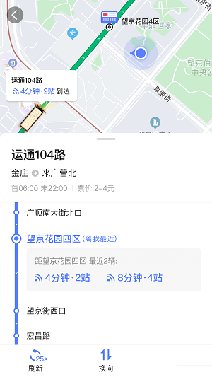 支持实时公交的显示,公交路线显示最近2辆车到达的时间,及还有多少站即将抵达;