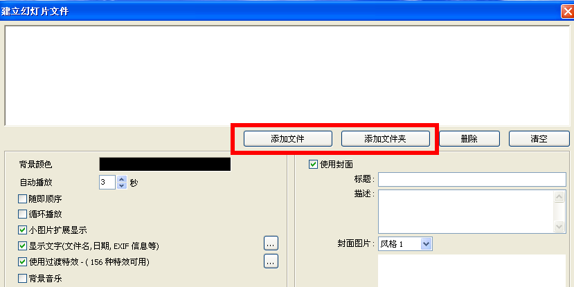 接着选择顶部的“添加文件”或者“添加文件夹”把需要制作幻灯片的图片体添加上去,可以拖动调节每张图片的播放顺序。