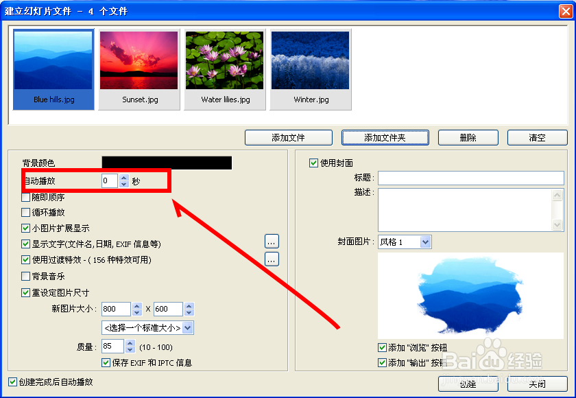 默认是自动播放的延迟时间3秒,这里我们可以把“自动播放”设置为“0”就可以鼠标点击播放。