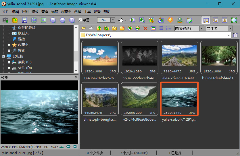 打开FastStone Image Viewer,操作界面和ACDSee非常相似。左上方是文件树状目录窗口,左下方是图片预览窗口,右侧是当前文件夹内容窗口。这样的设计使你可以快速切换目录,迅速进行图片浏览(1)。