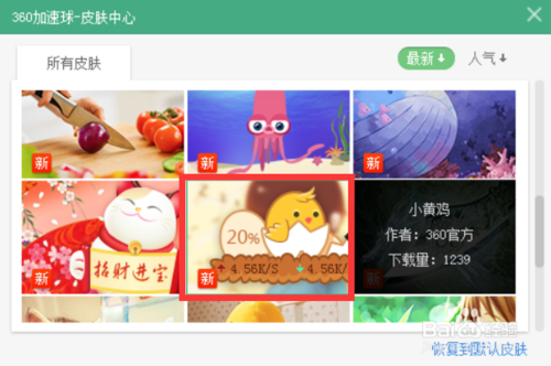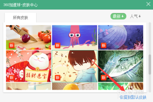 如果我们想恢复360加速球的默认皮肤,只需要 在“换肤中心”界面中点击右下角的“恢复默认皮肤”按钮即可。
