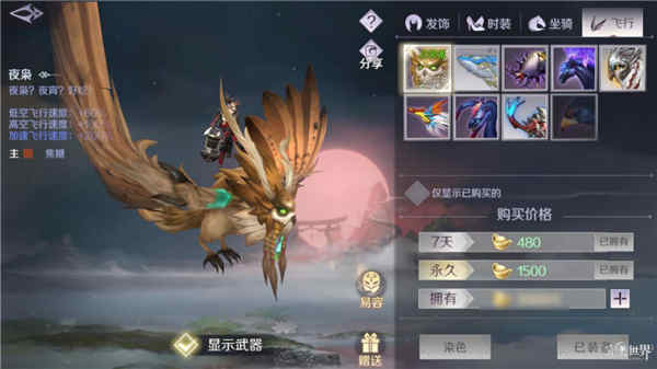 不同族系的飞行外观是不一样的,例如妖兽为飞行巨兽、人族为御剑飞行。如果需要更换飞行外观的话,只需要点击飞行界面右上方的“飞行”,然后购买喜欢的飞行外观即可,不同的飞行外观带来的属性加成是不同的哦!